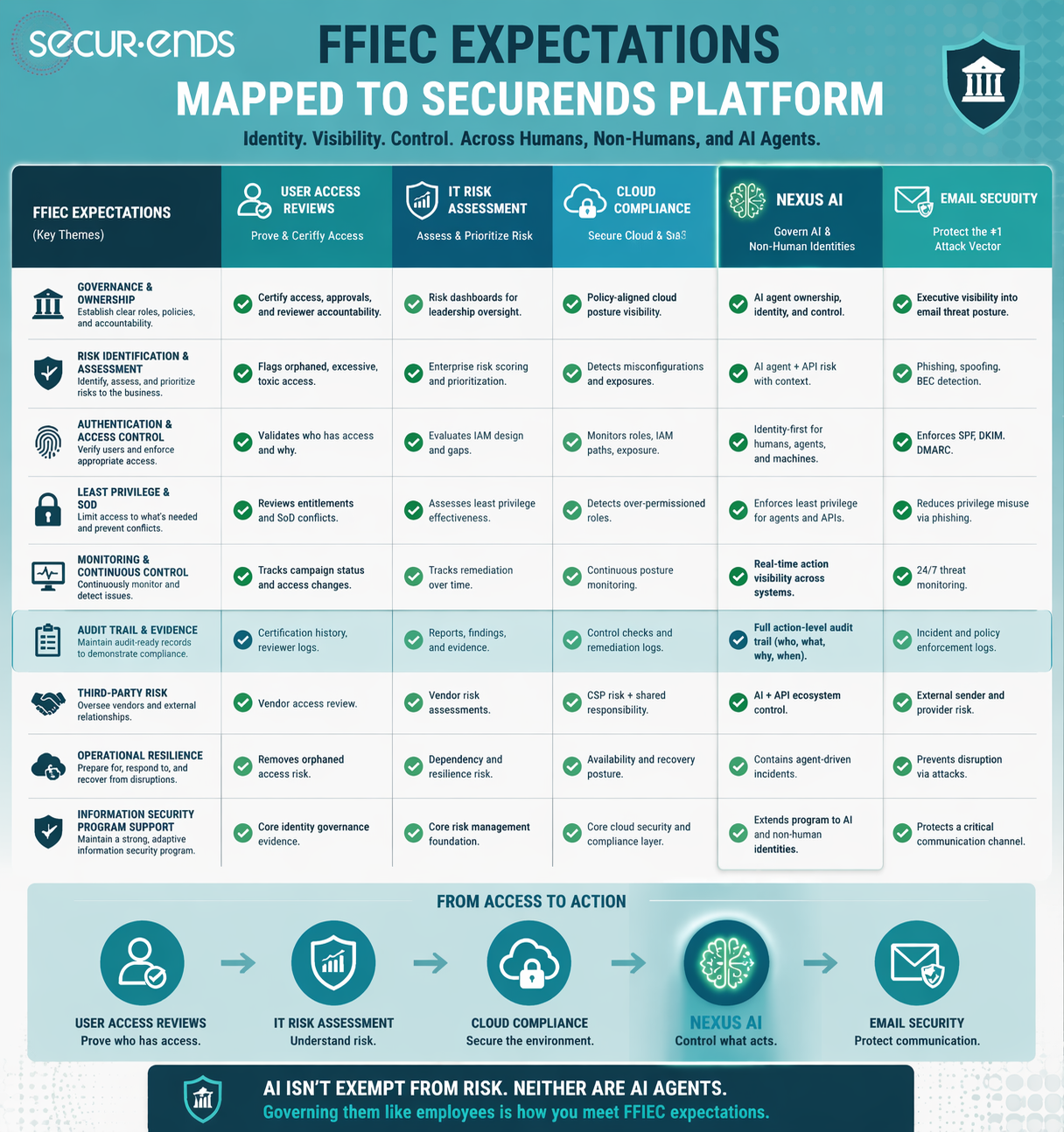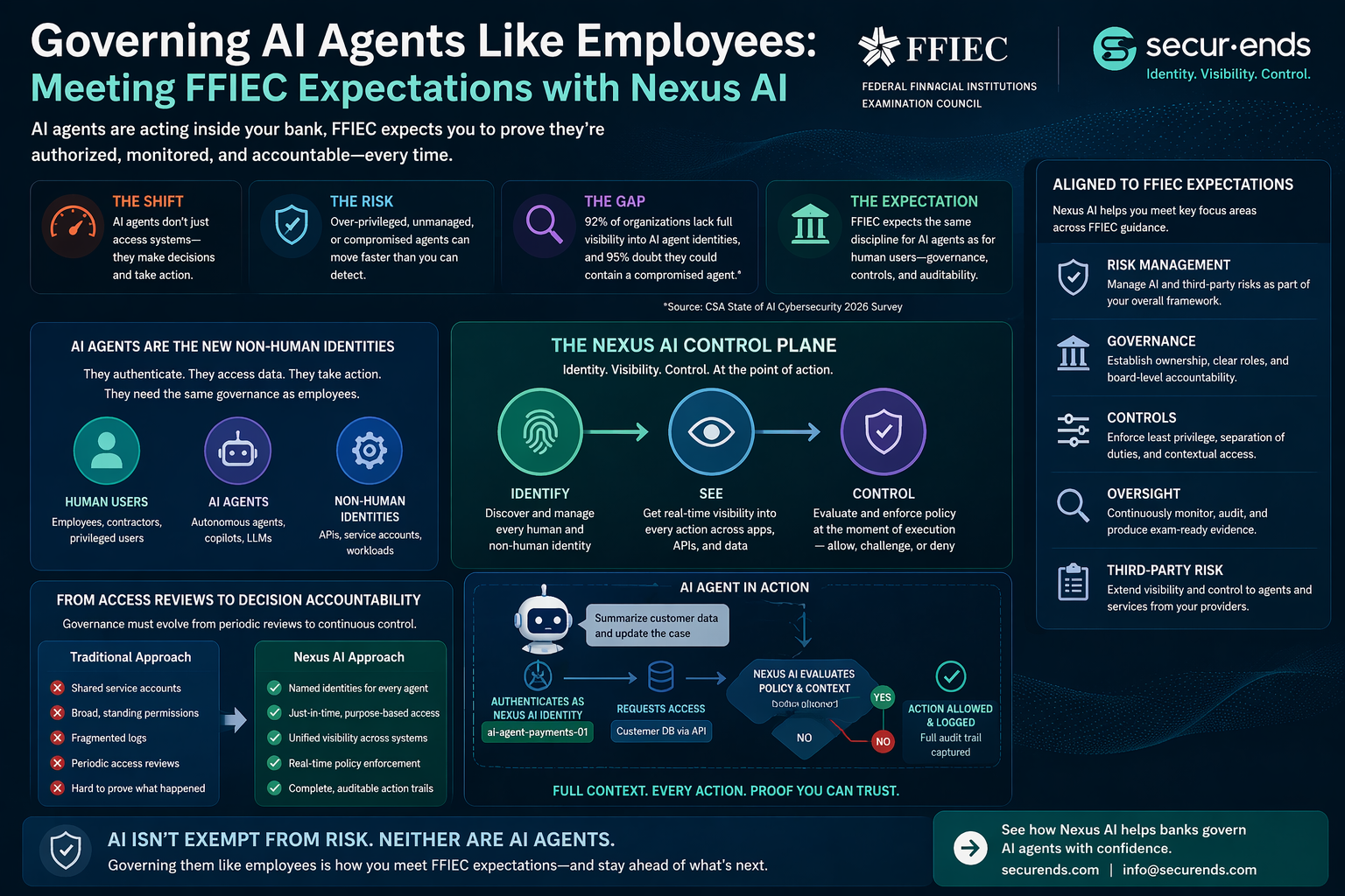SecurEnds, shared an update Posted17 hours and 13 minutes AGO AI agents are already acting inside banks. They’re accessing systems, calling APIs, moving data, and triggering workflows—often without clear ownership or accountability. FFIEC isn’t going to ask if it was AI. It’s going to ask: Who acted? What did they do? Why was it allowed? Can you prove it? That’s the shift—from access governance to decision accountability. Read More AI agents are already acting inside banks. They’re accessing systems, calling APIs, moving data, and triggering workflows—often without clear ownership or accountability. FFIEC isn’t going to ask if it was AI. It’s going to ask: Who acted? What did they do? Why was it allowed? Can you prove it? That’s the shift—from access governance to decision accountability. Wrote about how governing AI agents like employees is becoming the only way to meet FFIEC expectations—and how SecurEnds Nexus AI brings identity, visibility, and control together to make that possible. www.linkedin.comGoverning AI Agents Like Employees: Meeting FFIEC Expectations with Nexus AI | Abhi SoodAI agents are already acting inside banks. They’re accessing systems, calling APIs, moving data, and triggering workflows—often without clear ownership or accountability. FFIEC isn’t going to ask if it was AI. It’s going to ask: Who acted? What did they do? Why was it allowed? Can you prove it? That’s the shift—from access governance to decision accountability. Wrote about how governing AI agents like employees is becoming the only way to meet FFIEC expectations—and how SecurEnds Nexus AI brings identity, visibility, and control together to make that possible.www.linkedin.comSecurEnds | LinkedInSecurEnds | 4,674 followers on LinkedIn. Identity - Security - Governance - Compliance - Zero-Trust Software | SecurEnds is a modern Identity Security & Governance company helping enterprises secure access across human, machine, and AI-driven identities in today’s hybrid, cloud-first world. Our platform delivers smart identity governance by unifying identity lifecycle management, access certifications, policy enforcement, and audit-ready compliance—while extending zero trust principles to non-human identities, APIs, cloud services, and emerging AI agents. Trusted by organizations across financial services, healthcare, manufacturing, and technology, SecurEnds enables security and compliance teams to: Govern access with clarity and confidence Reduce identity-related risk across users, applications, and infrastructure Meet regulatory requirements with continuous visibility and automated controls Scale identity programs without operational friction Built for security leaders who demand both depth and simplicity, SecurEnds combines enterprise-grade governance with an intuitive experience—designed to adapt as identity landscapes evolve. Read Less